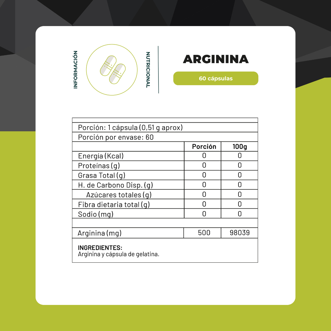 La Arginina es un aminoácido que participa en diversos procesos del organismo, especialmente en la producción de óxido nítrico, compuesto que favorece la circulación sanguínea. Nuestra fórmula entrega 500 mg de L-Arginina por cápsula, en un formato práctico de 60 cápsulas.