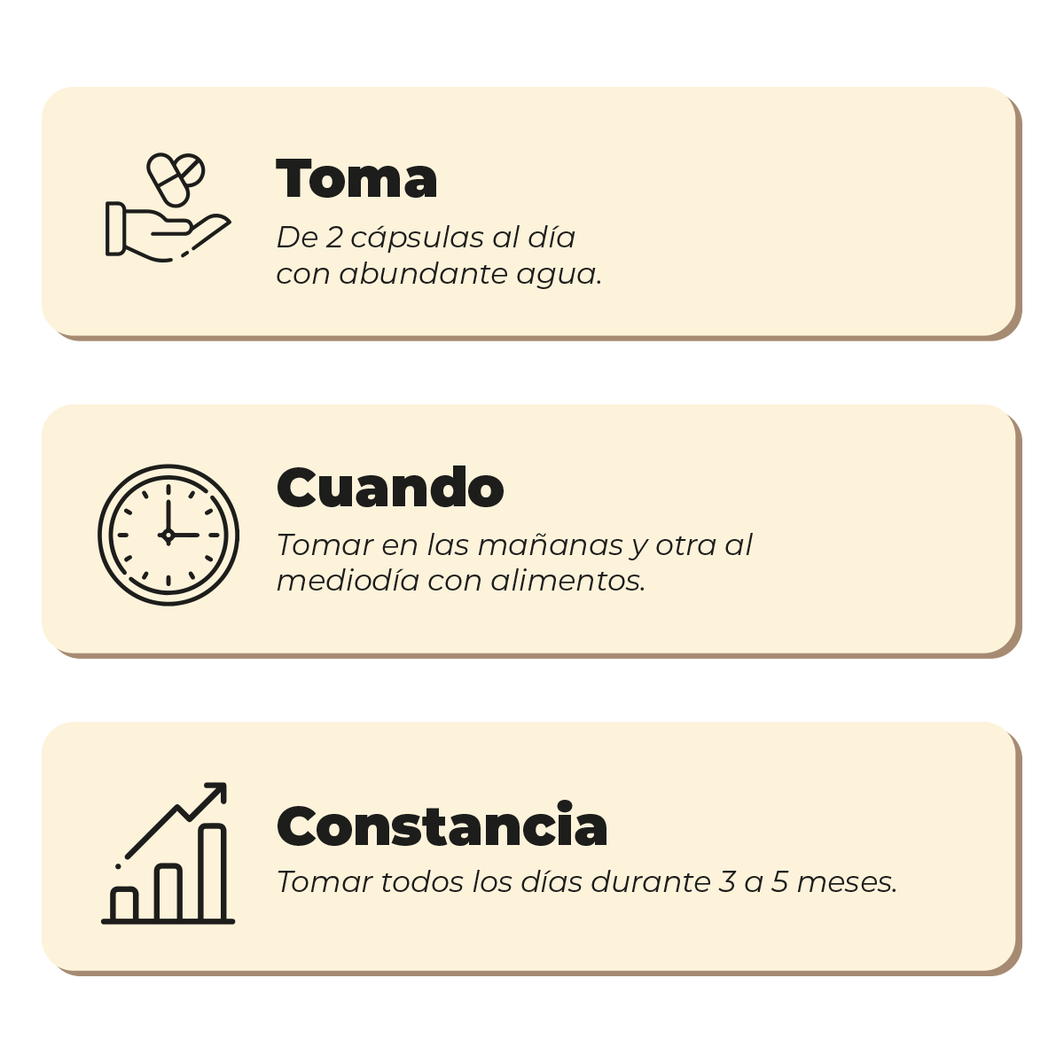 Apoya la producción natural de colágeno, contribuyendo a mantener la firmeza y elasticidad de la piel y al fortalecimiento de tejidos conectivos.