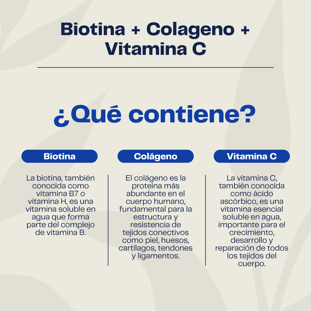 La biotina favorece el crecimiento y la fortaleza del cabello y las uñas, aportando vitalidad y resistencia.