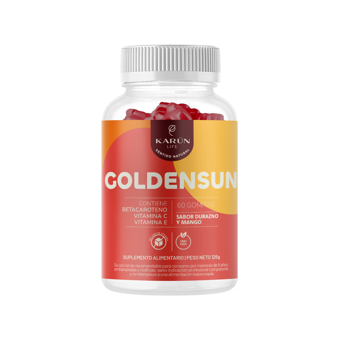 GOLDENSUN de Karün Life es un suplemento en formato gomitas formulado con Vitamina C, Vitamina E y Betacaroteno, nutrientes reconocidos por su acción antioxidante y su aporte al cuidado de la piel, la salud cardiovascular y el bienestar general. Con un delicioso sabor a durazno y mango, es una forma práctica y agradable de complementar tu alimentación diaria.