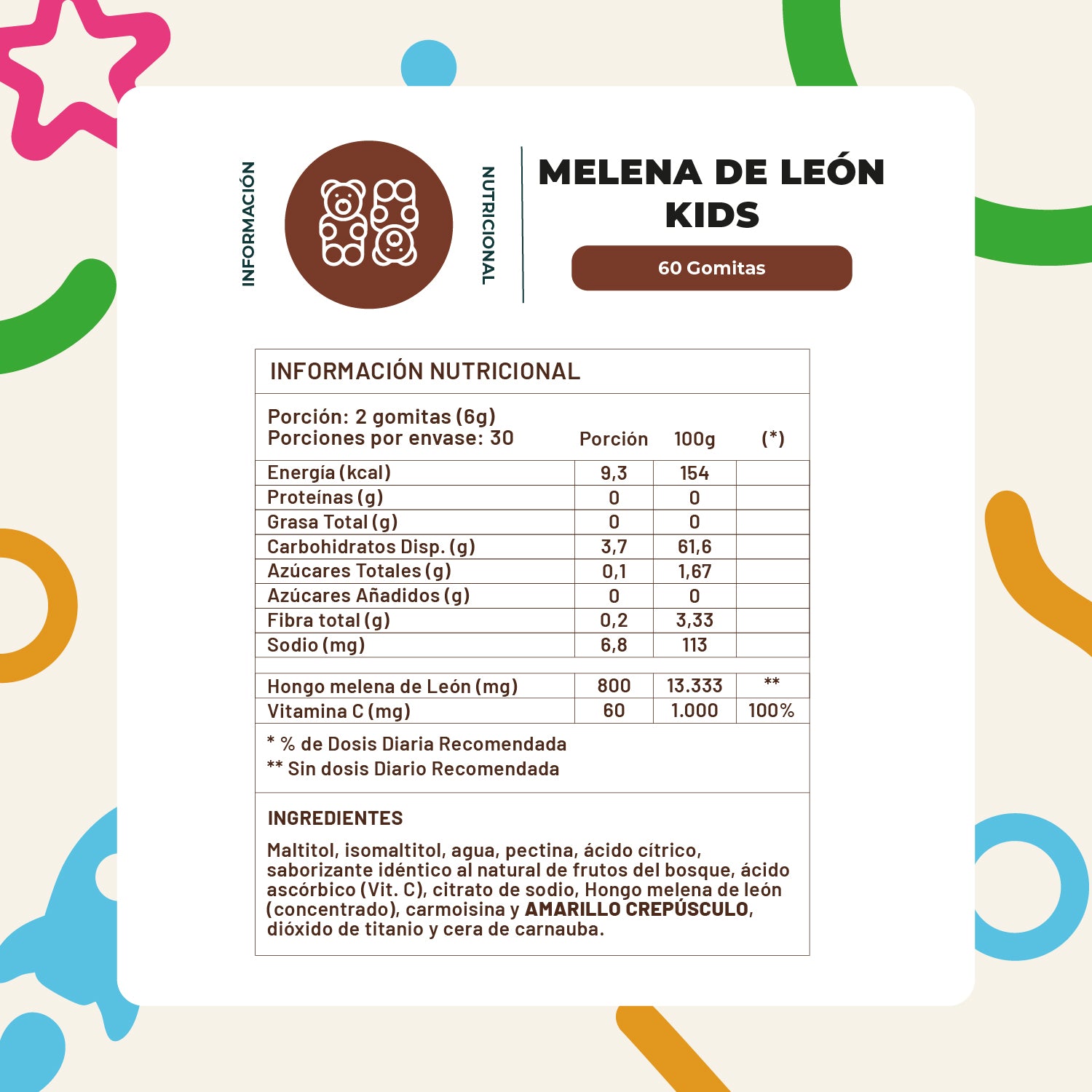 Potencia la concentración, memoria y bienestar de los más pequeños con nuestras Melena de León Kids. Estas deliciosas gomitas están formuladas con extracto concentrado de Hongo Melena de León y Vitamina C, dos aliados naturales para apoyar el desarrollo cognitivo, la energía y las defensas del organismo.