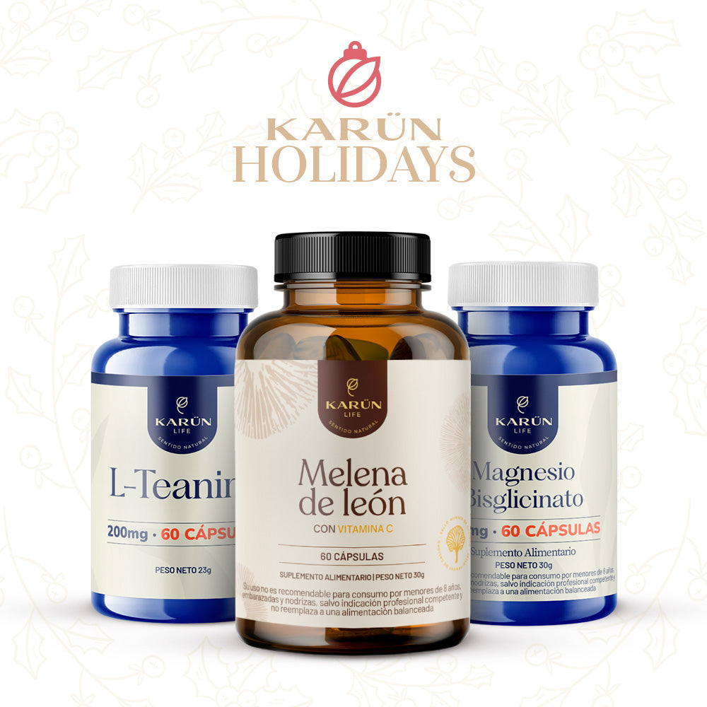 El Pack Karün Life Relax Mood reúne tres fórmulas naturales diseñadas para apoyar la relajación, la claridad mental y el equilibrio emocional diario. Incluye L-Teanina, ideal para una calma profunda sin somnolencia; Melena de León, un adaptógeno que potencia la claridad mental y el bienestar; y Bisglicinato de Magnesio, mineral esencial para relajar cuerpo y mente. Juntos, crean un sistema integral para quienes buscan equilibrio mental, enfoque sostenido y bienestar interno.