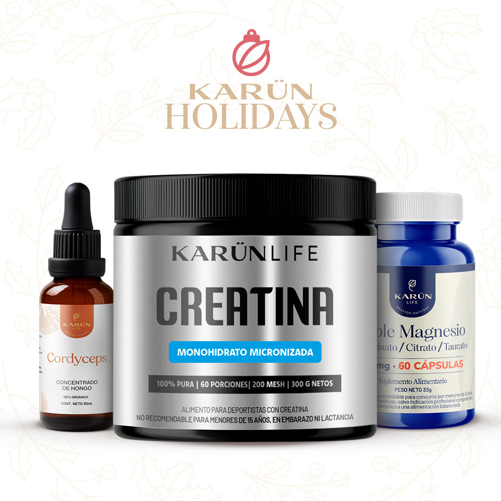 El Pack Karün Life Sport reúne tres fórmulas esenciales para deportistas, entrenamientos intensos y personas que buscan mejorar su rendimiento físico, energía diaria y recuperación muscular. Combina la potencia adaptógena del Cordyceps líquido, el equilibrio muscular y nervioso del Magnesio Combinado, y el impulso directo de fuerza y desempeño de la Creatina Monohidratada en Polvo. Juntos, forman un sistema completo para entrenar con más energía, resistir más y recuperarte mejor.
