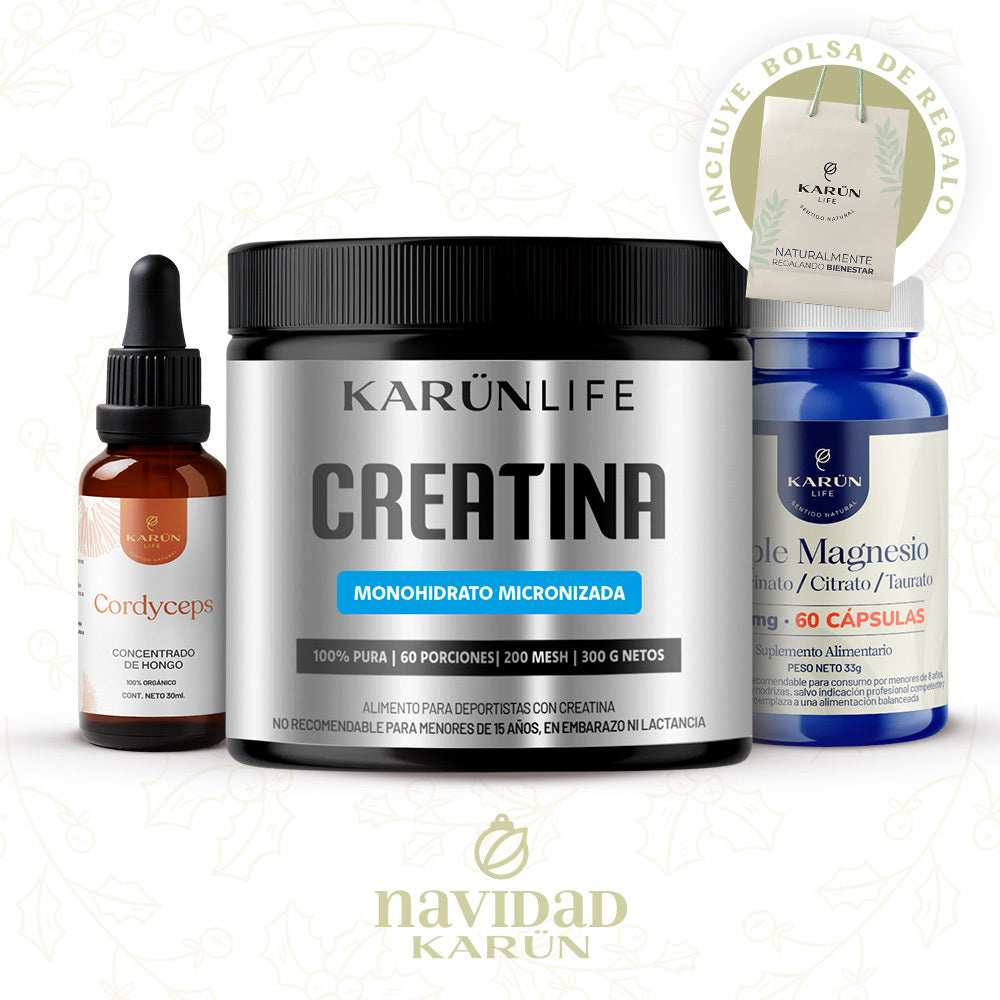 El Pack Karün Life Sport reúne tres fórmulas esenciales para deportistas, entrenamientos intensos y personas que buscan mejorar su rendimiento físico, energía diaria y recuperación muscular. Combina la potencia adaptógena del Cordyceps líquido, el equilibrio muscular y nervioso del Magnesio Combinado, y el impulso directo de fuerza y desempeño de la Creatina Monohidratada en Polvo. Juntos, forman un sistema completo para entrenar con más energía, resistir más y recuperarte mejor.