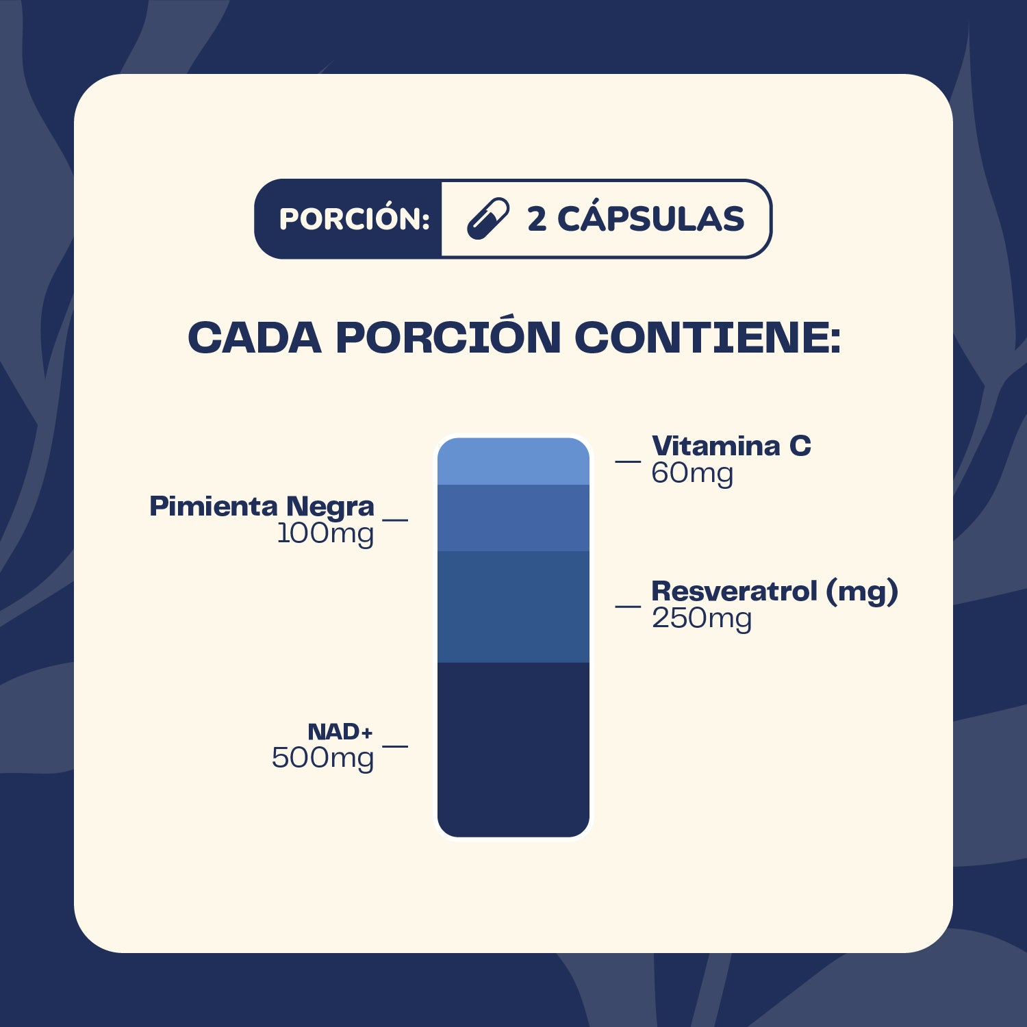 -Tomar 2 cápsulas de Resveratrol NAD+ al día, con abundante agua, idealmente junto al desayuno.