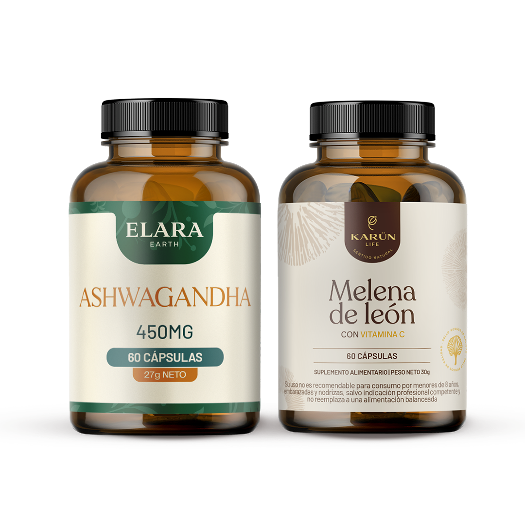 Disfruta de la sinergia perfecta entre dos adaptógenos naturales: la Ashwagandha, reconocida por su capacidad para reducir el estrés y mejorar la energía, y la Melena de León, un hongo funcional que potencia la memoria, concentración y bienestar cerebral. Este pack está diseñado para quienes buscan un equilibrio físico, mental y emocional de manera integral.
