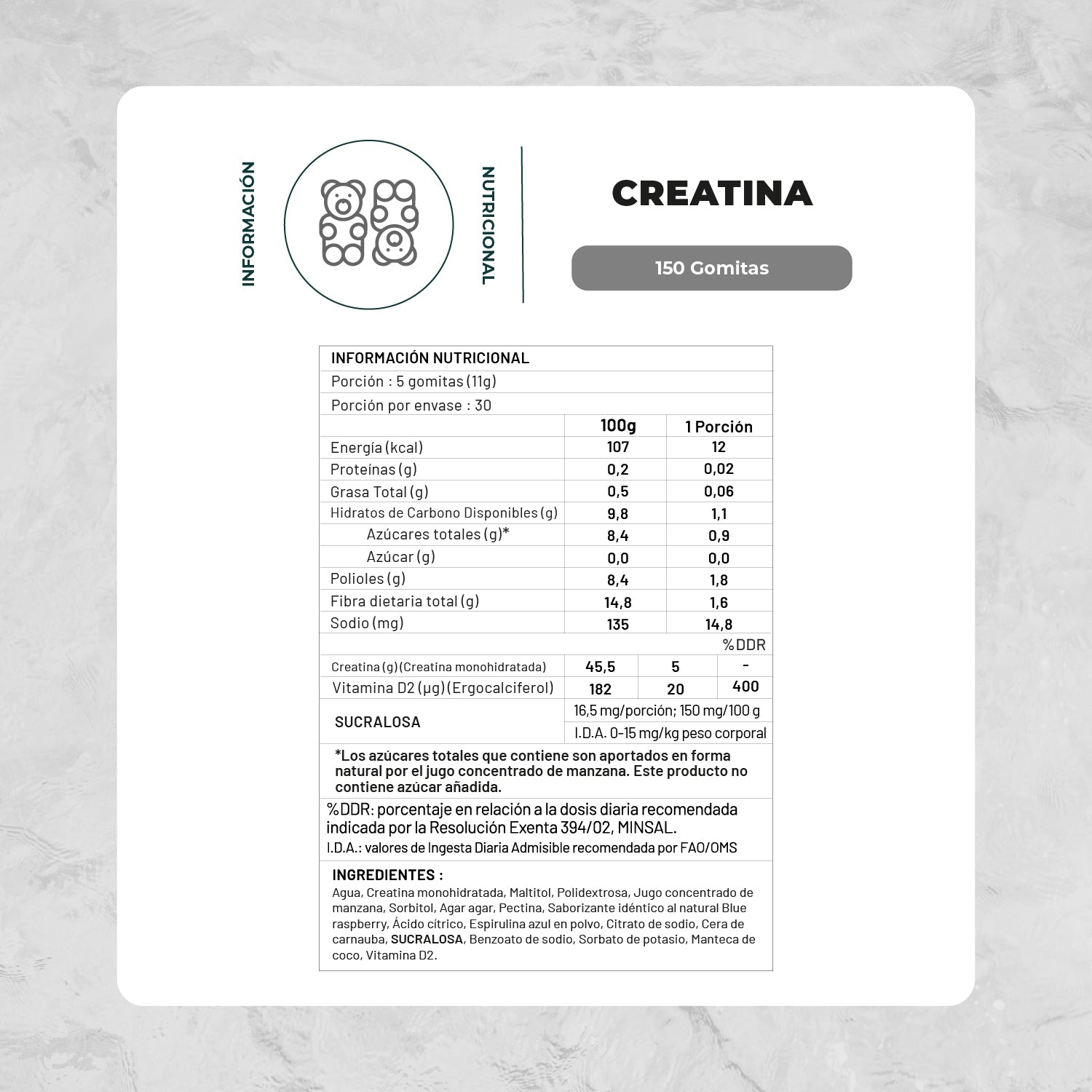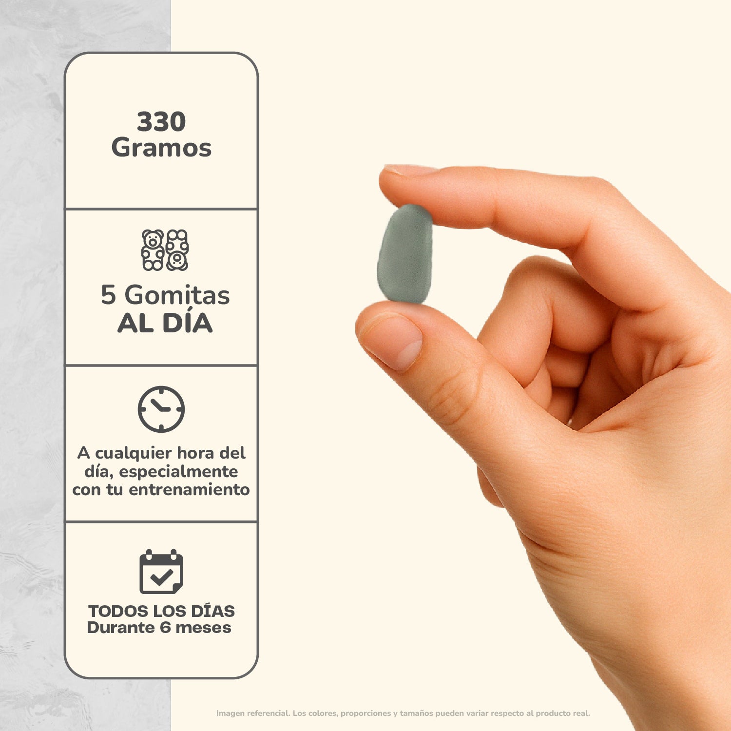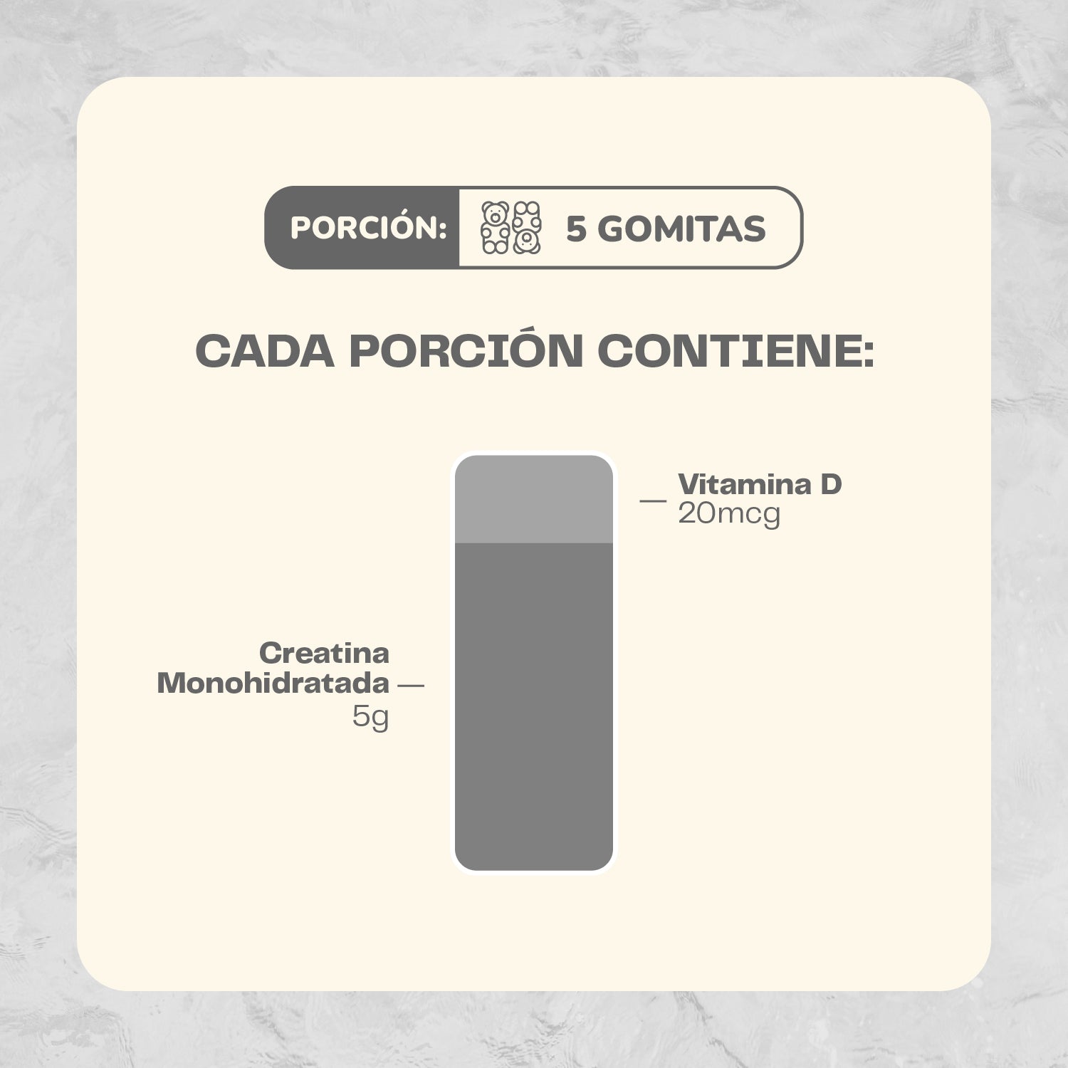 Gomitas de Creatina: Tomar 5 gomitas al día.