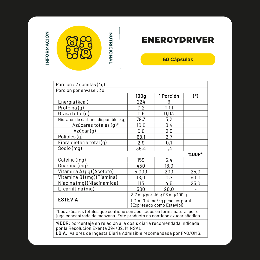Gomitas Energy: Tomar 2 gomitas en la mañana o antes de actividades que requieran energía y concentración.
