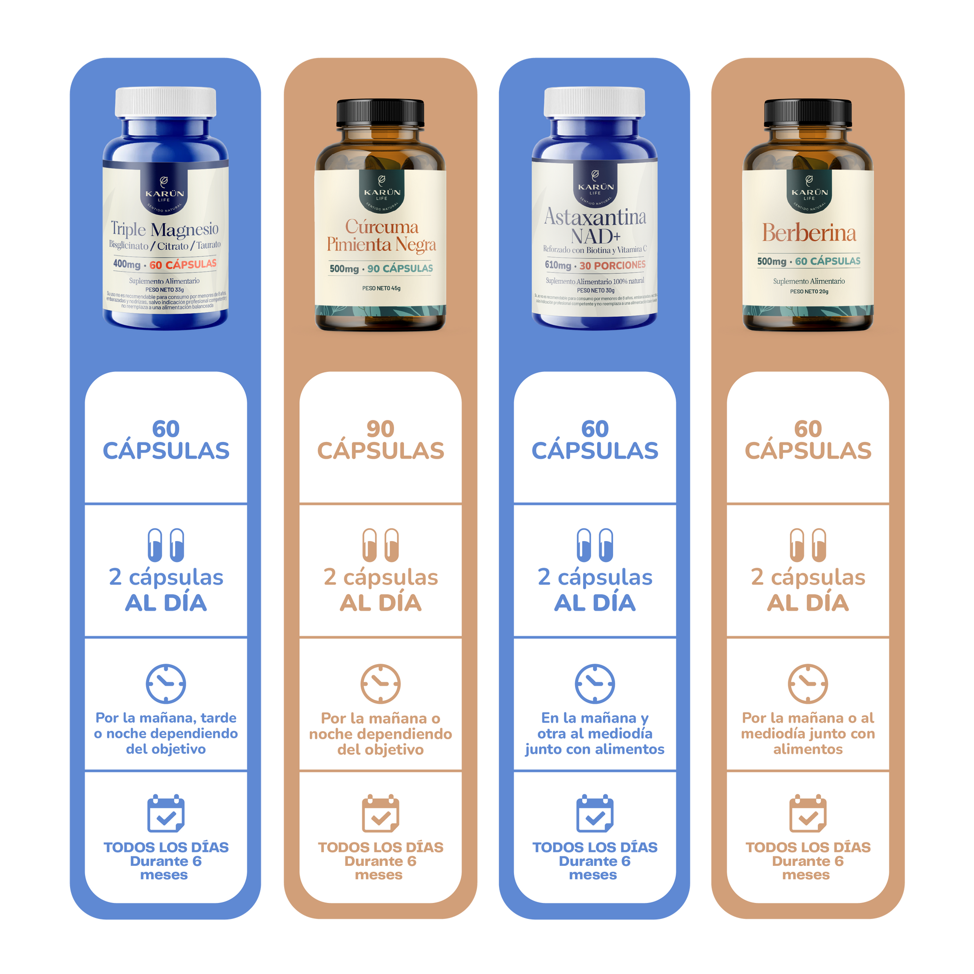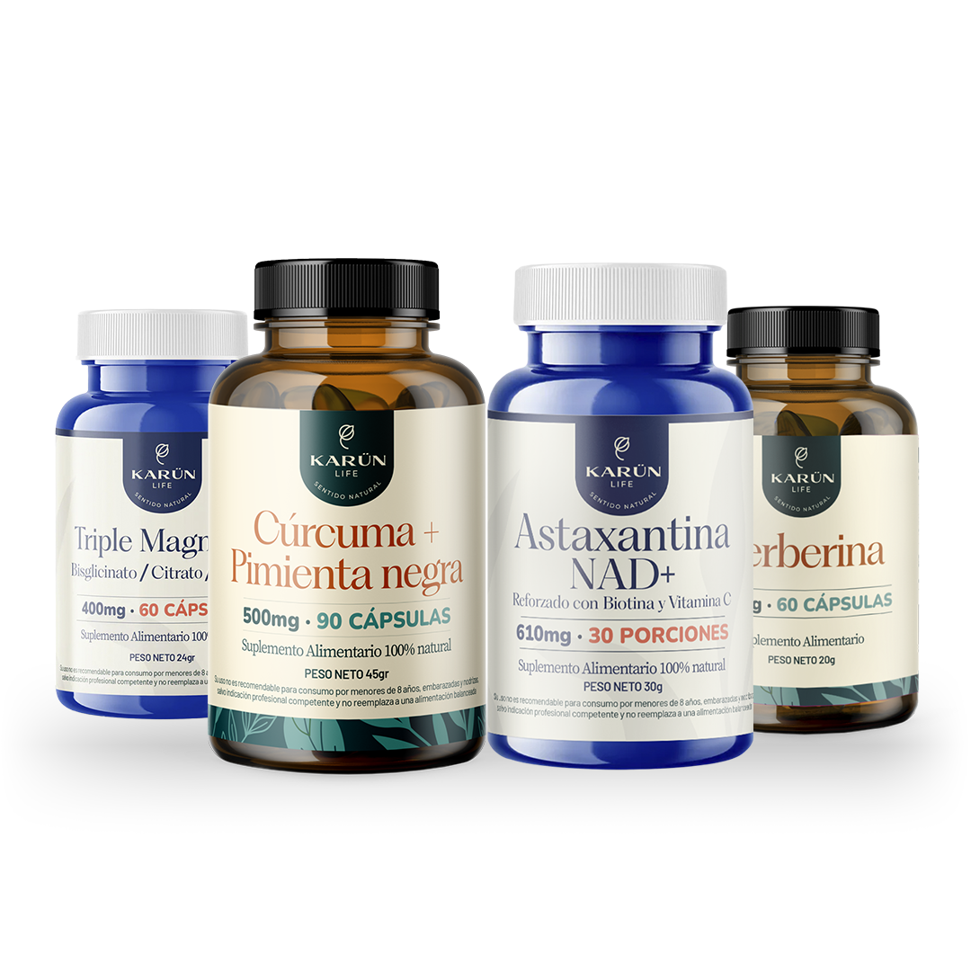 El Pack Esenciales de Karun Life reúne cuatro suplementos clave para apoyar el bienestar general del organismo: Magnesio Combinado para relajación y función muscular, Cúrcuma + Pimienta Negra para protección antioxidante, Astaxantina NAD+ para energía celular y belleza desde el interior, y Berberina para equilibrio metabólico. Juntos forman una base completa para sentirte con más vitalidad, equilibrio y bienestar diario.