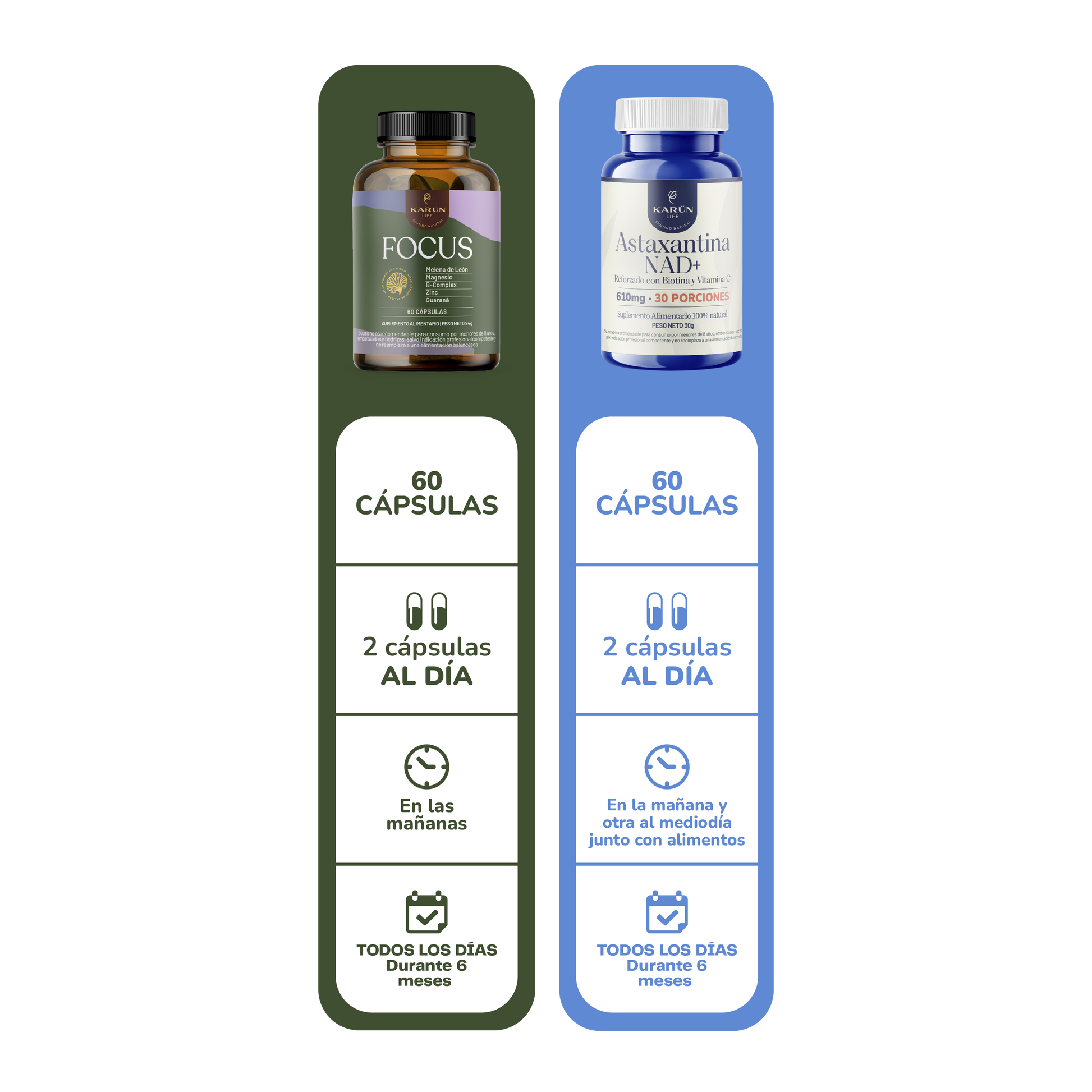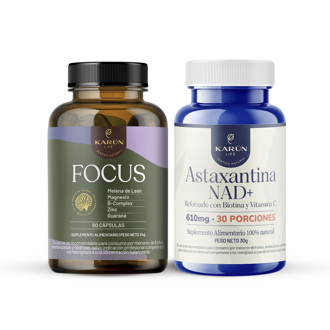 Descubre el poder del Pack Focus Potenciado de Karun Life, una combinación diseñada para potenciar el enfoque mental, la energía celular y la vitalidad general. Este pack reúne dos fórmulas complementarias: Focus, que impulsa la concentración y el rendimiento cognitivo, y Astaxantina NAD+, que aporta energía celular y protección antioxidante para cuerpo y mente.