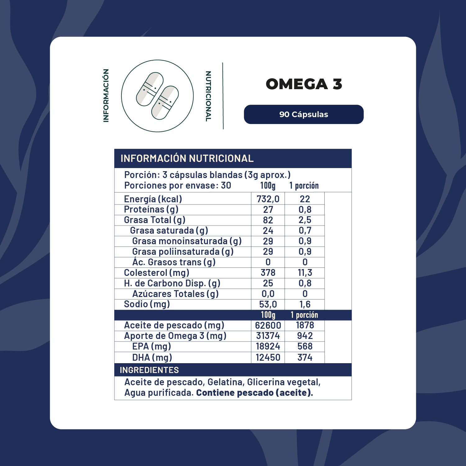 Omega 3: 3 cápsulas diarias, acompañadas de agua.