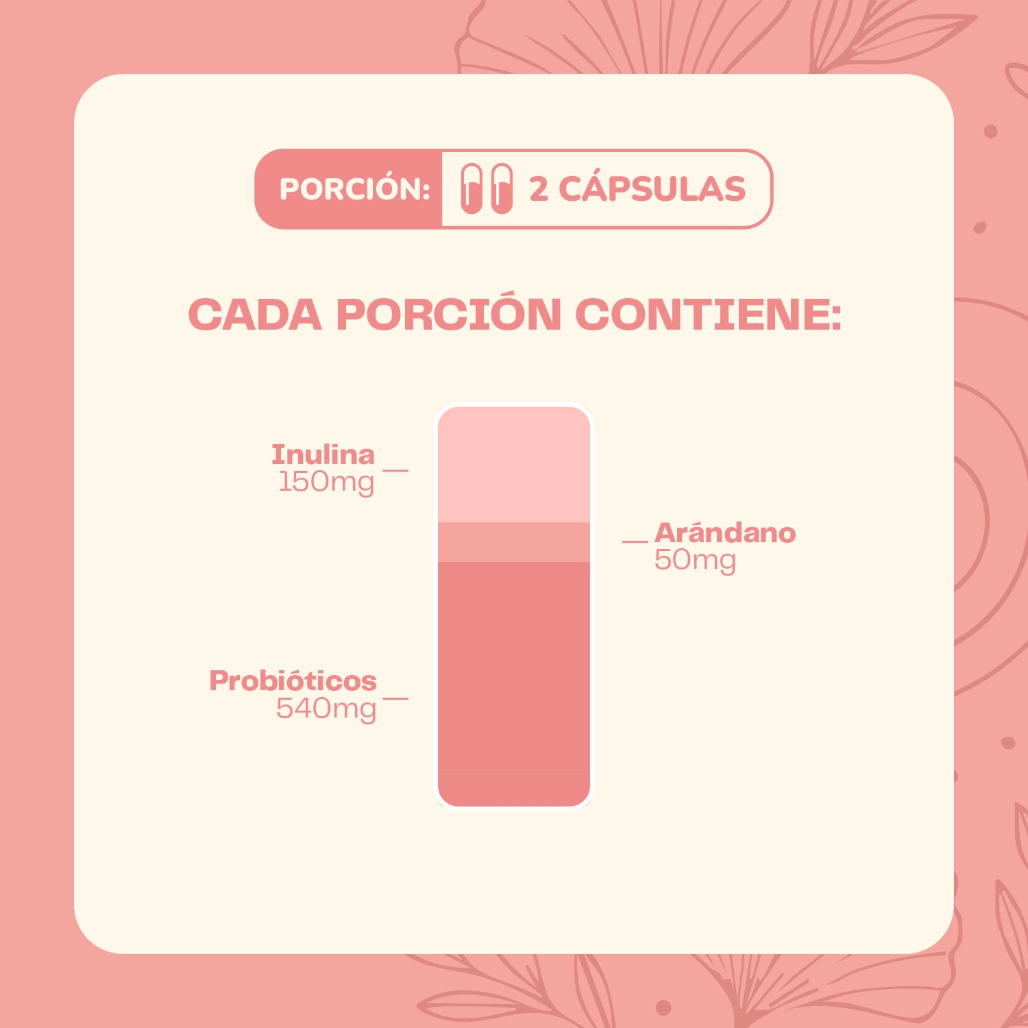 Probiótico Mujer: Inulina, Lactobacillus reuteri, Lactobacillus rhamnosus, Lactobacillus gasseri, Lactobacillus crispatus, Lactobacillus fermentum, Bifidobacterium lactis, Bifidobacterium longum y extracto de arándano.